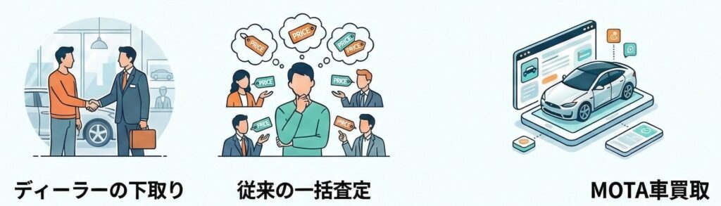 下取り・一括査定・MOTAを比較